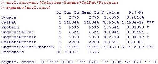 Inmediatamente podemos ver que los términos azúcares, azúcares * CalFat y CalFat * proteína no son significativas al nivel.05. Alternativamente vemos que CalFat y azúcares * CalFat * proteína son los mejores términos respectivamente con valores P.05 mucho menos entonces.