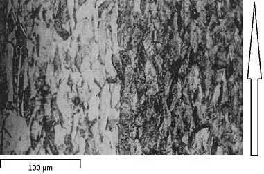 Figura 2. Microestructura de bimetal shell bajo especificación Kanthal 94S bimetal tira, especificación a través de su grueso, la flecha muestra dirección del balanceo