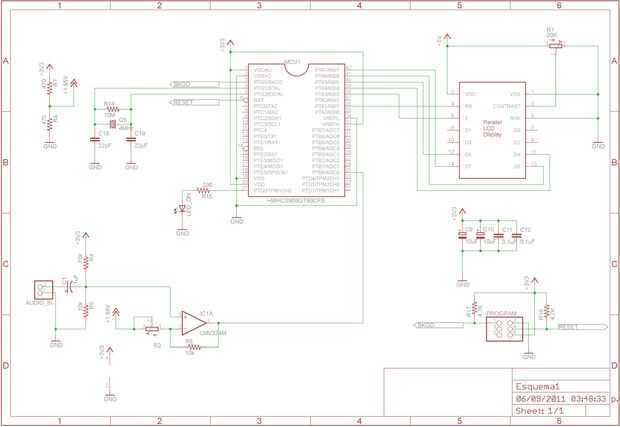 Básicamente el poder es representar la señal de audio separada en frecuencia, para esto que tenemos que muestra la señal de acuerdo con el teorema de muestreo Teorema de muestreo de Nyquist, Shannon . Una señal de audio "audible" para el oído humano está en el rango de 20Hz a 20Khz, en nuestro caso que vamos a realizar un muestreo completo de la banda. Para esta frecuencia mínima de muestreo debe ser 40 KHz. utilizando un microcontrolador Freescale HCS08GT60 familia (8 bits) y el lenguaje ANSI C, configurar el convertidor ADC interno para tomar una muestra cada 25US (40 KHz) y así aplicar una FFT de 64 puntos en tiempo real (gracias al bus interno microcontrolador funcionando a 20 MHz), lo que resulta en 32 niveles representando a frecuencias de 20 Hz a 20 kHz con un rango de 312,5 Hz cada nivel. Como tenemos una pantalla de 16 x 2 caracteres, hicimos un promedio del valor de los niveles contiguos para obtener resultados en 16 niveles y representar como barras (caracteres personalizados en LCD de caracteres ver Tutorial).