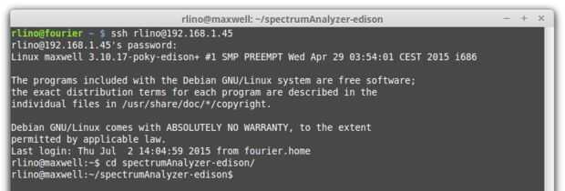 Los usuarios de Windows: descargar e instalar putty. Ejecutar masilla y seleccione la opción de SSH en la pantalla principal. En el campo Nombre de Host, tipo Edison tablero IP. En el puerto, escriba 22 y, a continuación, haga clic en abrir. Accede con tu usuario y contraseña de usuario de Edison e ir a la carpeta del analizador de espectro.
