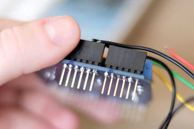 El escudo VU viene con un conjunto de pines de cabezal conectarse a Arduino. Estos deben ser soldadas ya que las conexiones son demasiado flojas simplemente conectar incluso para propósitos de prueba. Para consejos sobre cómo soldar el escudo para Arduino, ver a esta gran guía de Sparkfun.