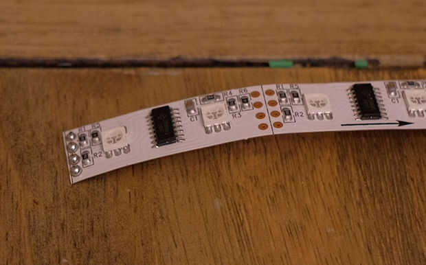 Los conectores con soldadura de estaño. Esto hace mucho más fácil soldar los cables. Otra vez, prestar atención a la dirección de la flecha; Observe cómo está apuntando lejos de la soldadura. Se trata de los flujos de datos de la dirección, y si se los mezcla podría dañar la tira.