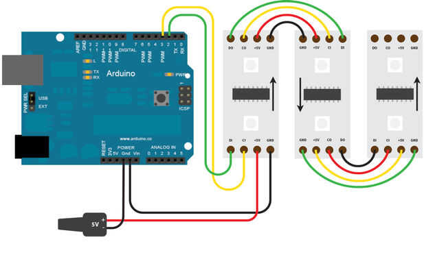 Estos LEDs tienen cuatro pines; tierra, 5 v, C (reloj) y D (datos). Algunas secciones de la tira tienen valores marcados en ellos, algunos no. Está bien, sólo ten en cuenta de que pin es soldar a. Consulte el diagrama de cableado como ir y comprobar la dirección que tus franjas se enfrentan.