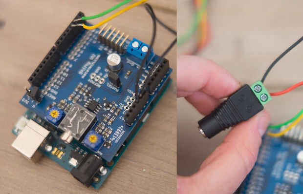 Desde el lado de entrada de inicio del arreglo tira, conecte el cable de datos verde Pin 2, y el reloj amarillo alambre al Pin 3. El cable rojo de 5V se conecta directamente a la fuente de alimentación, y el poder y la tira del LED comparten un terreno común con el Arduino.
