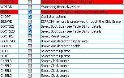 Primero de todo lo que necesitas para programar el AVR con código del accesorio, si usas 16 * 2 display necesita a parpadear el código de la versión de 16 * 2, etc.. Utilice cualquier proggramer avr. Usted necesitará configurar fusebits como se muestra, por ejemplo en quemaduras-o-mat, el avrdude GUI. Es necesario establecer el cristal externo 16MHz y activar el fusebit CKOPT. Eso es todo.