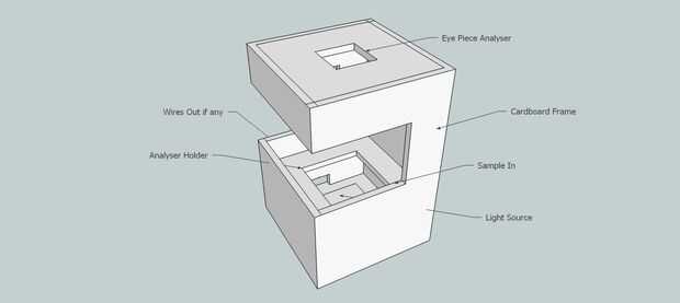 - Nuestro analizador de estrés es muy simple con una fuente fuerte de luz, un polarizador, un analizador y un portamuestras todas contenidas en un marco.