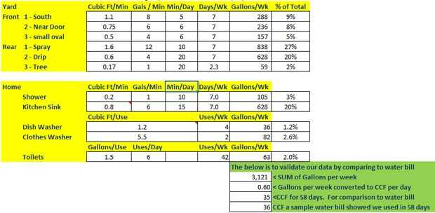 La tabla anterior muestra lo que tengo, por ejemplo. La primera fila significa que cuando encendí el riego en nuestro jardín que cubre el extremo sur y visto el medidor durante un minuto, la flecha roja fue aproximadamente 1,1 veces. 1.1 veces 7,48 galones por pie cúbico de multiplicar tengo 8 galones por minuto. El programador se encuentra a 5 minutos al día, 7 días a la semana, esta válvula del aspersor. 8 * 5 * 7 = 288. 3.121 es la suma de los galones por columna de semana.