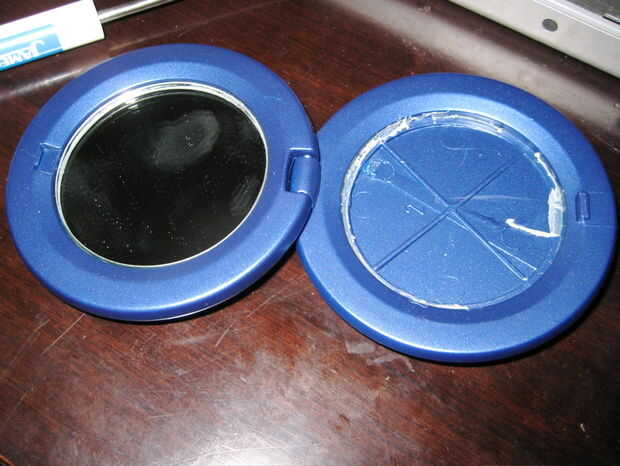 Espejo. Cualquier pequeño no magnificado redondo o cuadrado espejo aproximadamente 2 pulgadas de diámetro. Si no hay ningún ribete en el espejo, solo un borde de cristal, crea una línea borrosa bonita en el video que lo hace parecer casi el cuadro en el cuadro se hizo en post producción. Algunas personas le gustó espejos cuadrados más porque se veían como imagen en imagen en un televisor. Me gusta ronda porque cabe caras mejor.