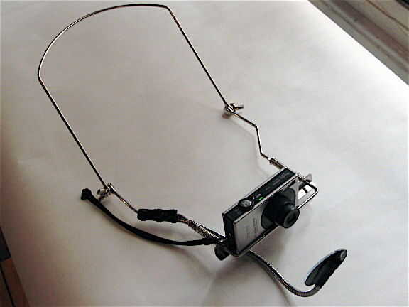 Cámara. Cualquier pequeño apunta y dispara con buena capacidad de audio y vídeo que cabe en un titular de la armónica y tiene un micrófono montado frontal. Encontré a la Canon SD1000 encaja perfectamente con el titular de la Lee Oskar y una gran cámara de video con enfoque amplio y un micrófono montado frontal. La colocación de micrófono significa que el entrevistado está hablando directamente en el mic y el entrevistador está hablando sobre ella, pero está más cerca, esto parece para equilibrar el volumen del audio.
