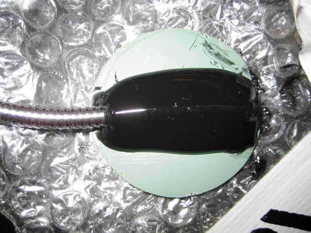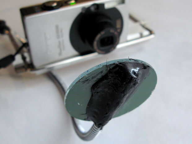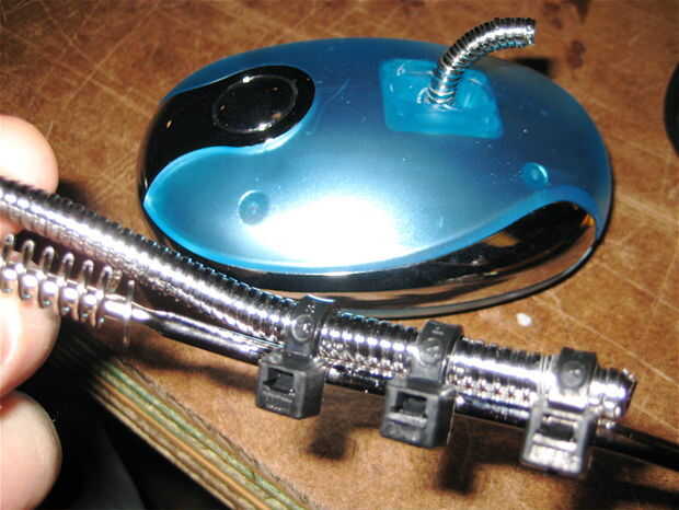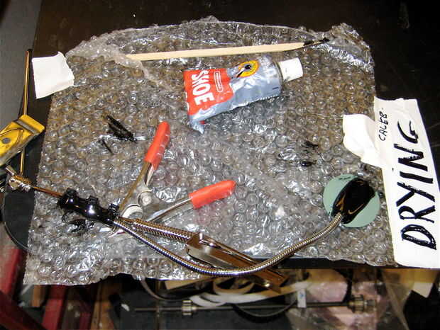 Abrazadera de la plataforma en una posición que le permite Shoe Goo los amarres de cable por un lado y Shoe Goo el espejo en el lugar así que la pipa de la flexión es en apretado contacto con el espejo.