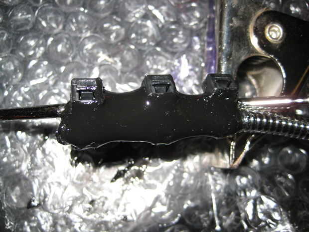 La gota Shoe Goo en bridas y la parte posterior del espejo liberalmente. Forma antes.