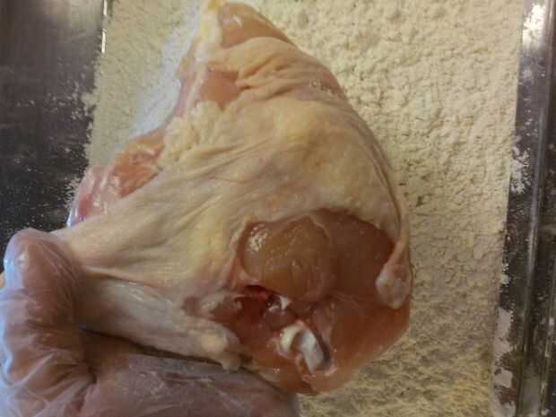 Primero vamos a usar y corte fino de carne de pecho. Esta es la parte fácil. Observación de la naturaleza. Se recorta la grasa y está listo para el siguiente paso. Harina!