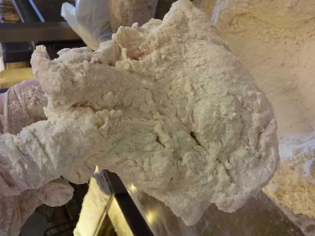Bañar el pollo crudo en harina. Demasiada harina es suficiente harina! Asegúrese de que everypart está cubierta uniformemente para que la carne está protegida por la harina durante el proceso de fritura