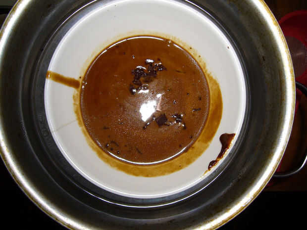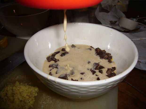 Quitar el jengibre rallado con un colador, vierta la mezcla de nata sobre el chocolate (paso 3).