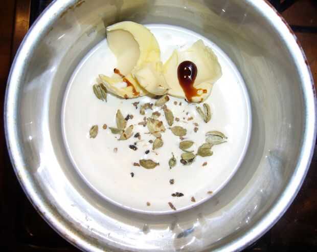 Romper las vainas de cardamomo con el lado plano de un cuchillo, añadir a la mezcla de crema en el paso 2. Cuando la crema comience a hervir, retire la cacerola del fuego y deja la mezcla escarpada para un extra de 5 minutos. Volver la sartén a fuego lento y llevar la mezcla a ebullición. Tensión a las vainas en el paso 3.