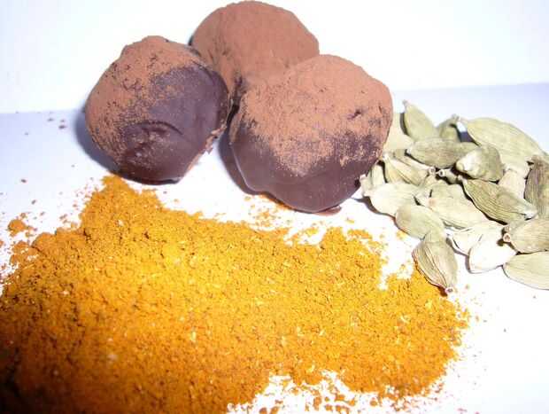 Algunas personas se pueden apagar por la idea de chocolate y polvo de curry, aunque es más para el color y el olor que por el sabor. Si no estás dispuesto a ser aventureros, cardamomo y chocolate es una combinación fabulosa por su cuenta. El olor del cardamomo con el chocolate es delicioso.