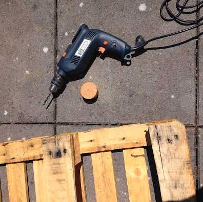 Para hacer la botella de fermentación, simple quitar el corcho de la jarra y poner en un banco de trabajo (o algo más que no te importa la perforación a través de... Usé un viejo palet).