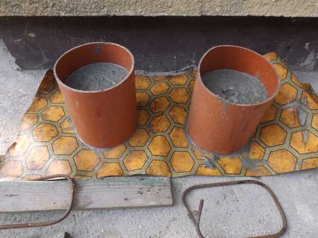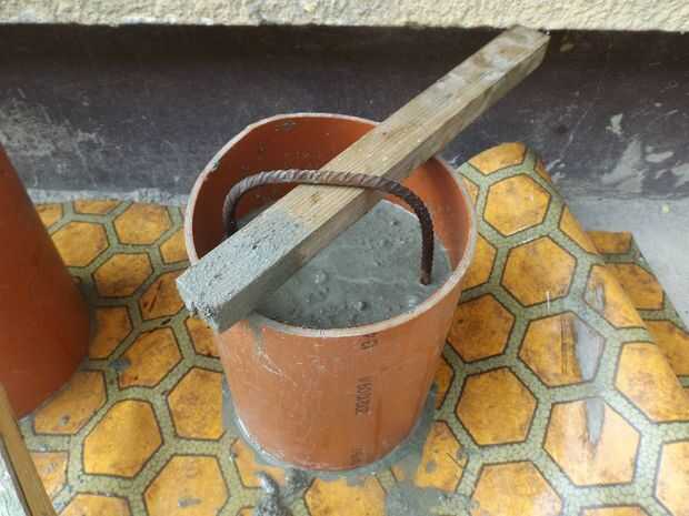 Vierte el hormigón de los tubos, luego colocar las barras dobladas en su lugar y fijo con pedazos de madera.
