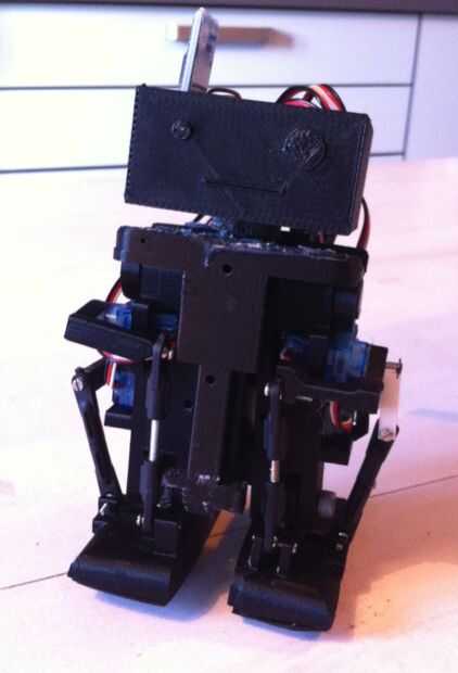 Usted puede encontrar aquí un buen ejemplo de un 3D robot imprimible llamado "tambaleante" (http://www.thingiverse.com/thing:170932) (). Estos andadores pasivos tienen algunos puntos comunes: han curvado pies, caderas gratis y no utilizan electrónica a caminar! (http://youtu.be/DtdJB49f4Yk)