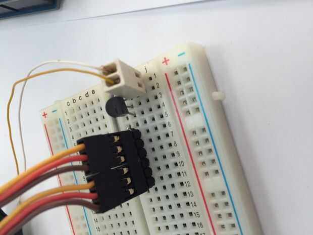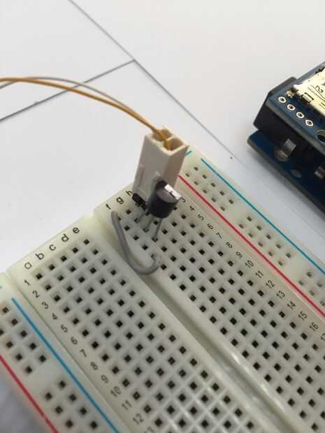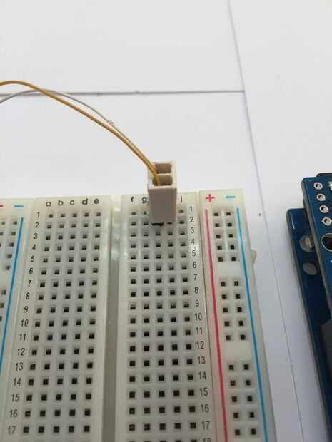 3) en el protoboard, inserte el cable blanco en el carril 1 y el cable amarillo en el carril 2.