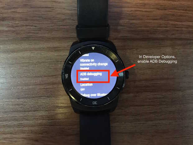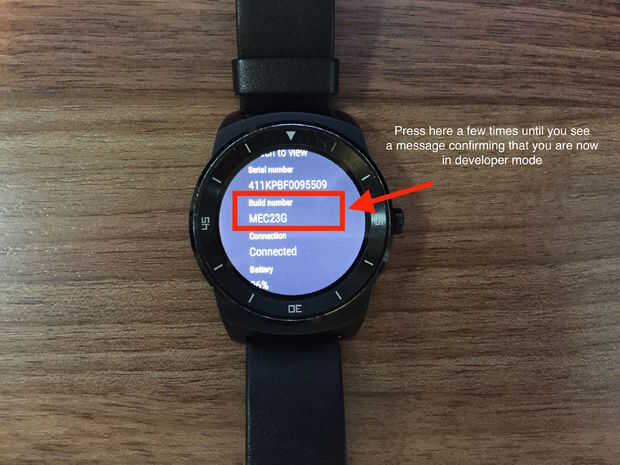 Desplácese hasta la aplicación de configuración de su reloj. Desplácese hasta la parte inferior y haga clic en acerca de. En la página, ver el número de construir. Haga clic varias veces hasta que aparezca un mensaje de confirmación que se encuentra ahora en modo desarrollador.