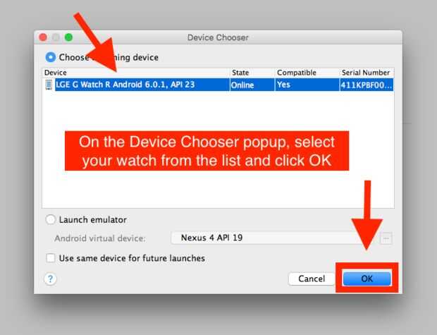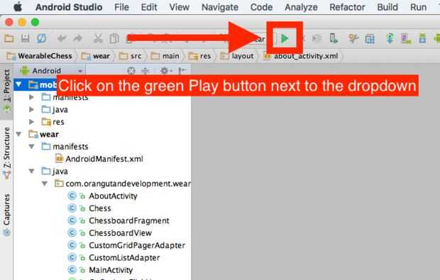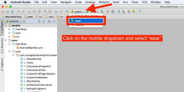 En la barra de herramientas de estudio Android en la parte superior, puede ver un menú desplegable con la palabra móvil. Si es el caso, haga clic en él y cambio para usar de lo contrario usted no será capaz de ejecutar la aplicación en el reloj. A continuación, haga clic en el botón de play verde justo al lado de la lista desplegable. En el menú emergente, seleccione el reloj de la lista y haga clic en Aceptar. Si no ves el reloj, más probable es que no ha conectado con éxito su reloj en el equipo o los controladores no están instalados correctamente. Deberá ingresar a la web del fabricante y descargar los drivers que necesitan o Compruebe la conexión entre el reloj y la computadora.