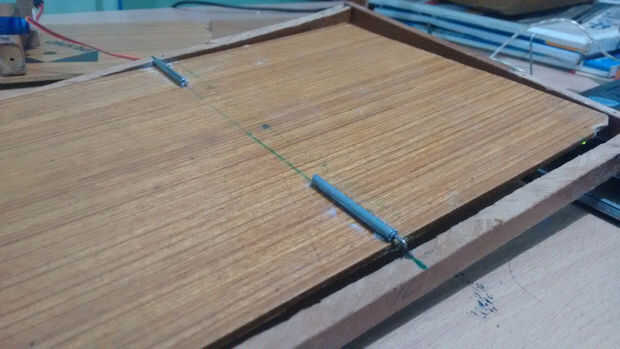 crear un marco más pequeño que la base, esto será nuestro eje x, en la cara externa de los bordes más pequeños de los pequeños agujeros de marco hace exactamente en el centro de los bordes. cortar las varillas en la mitad y pegarlas a los bordes grandes del marco hacia dentro. cortar en la mitad antes de hacerlo.