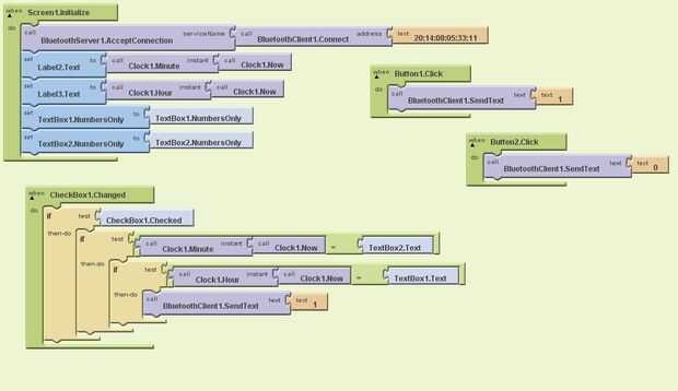 ** También, revisa el sitio del MIT App Inventor, google, crear una aplicación bastante simple para establecer un tipo de alarma de lo que hay que encender una luz en la mañana o algo. Mira las fotos para obtener un ejemplo del código. Coge la id de su bt y escribir en.