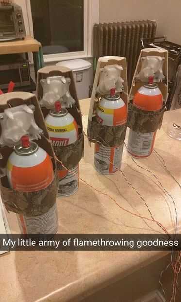Conducto de cinta las latas de a partir de líquido por lo que el martillo en la caja de engranajes toca la parte superior de la lata de aerosol. Enjuague, lavado y repetir hasta tener el número deseado de unidades flamethrowing.