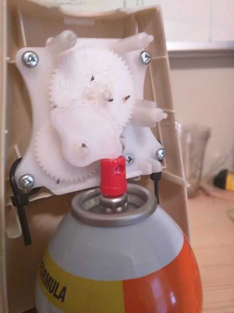 Los ambientadores Glade vienen con un motor, engranajes, una placa de circuito, un pulsador y un interruptor. Puesto que será controlar el motor con nuestros controladores de motor todos que tenemos es el motor. Abra el ambientador de aire y quite la cubierta delantera. Los engranajes y compañía se atornillarán en algunos tornillos muy singular (un poco del triángulo?). He encontrado que un pequeño maleficio o estrella poco funciona bien. Desenrosque la tapa y cortar todos los cables de la placa de circuito. Hay un botón en la parte trasera que se puede quitar para los cables de la serpiente en la espalda. He añadido algunos cables extra para alargar los cables del motor. Los engranajes de tornillo en su lugar.