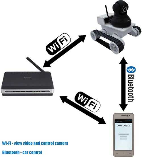 Como se ve en la figura anterior, la interacción entre el teléfono inteligente y plataforma con orugas implementado directamente en el canal de Bluetooth y la interacción con la cámara implementada en canal Wi-Fi, pero a través del router. Y esto es una gran desventaja - porque sin un router, todas las operaciones con la cámara no funcionará, por ejemplo, en la calle o en cualquier lugar fuera de la ciudad. He intentado hacer un control directo a través de Wi-Fi, a modo de Android'e Host Wi-Fi, pero nada funcionó. En el futuro, voy a intentar hacer una interacción directa sin un router. Tengo sugerencia que esto requiere una cámara con soporte Wi-Fi Direct.