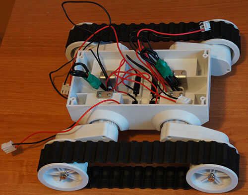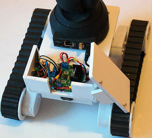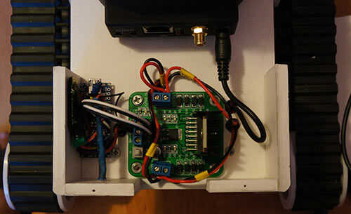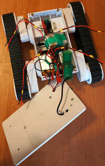 Baterías y convertidor Junta fueron colocados dentro del chasis. La cubierta fue cortar los agujeros para los cables al tablero de control, cámara y controlador de motor. Para cargar las baterías se pusieron conector 2. Cámara IP, Arduino, módulo Bluetooth y controlador de motor fueron montados en la cubierta del chasis.