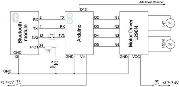 Utilizado por: Módulo Bluetooth HC-06 (3-4$ en AliExpress), Arduino Nano v3 y Motor Driver L298N. Si la energía de alimentación de la placa Arduino de 4V y arriba, entre el terminal RX (módulo HC-06) con la TX (tablero de Arduino) es necesario pone un divisor de tensión, porque HC-06 niveles de lógica es 3.3V. Mejor aún, utilizar chips especializados, como el MAX232.