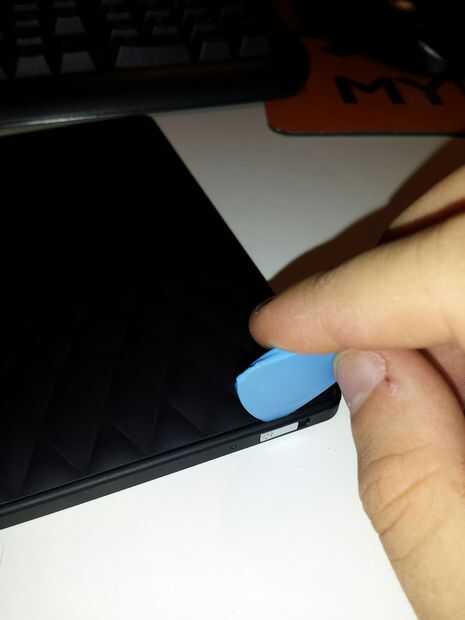 Tome la herramienta de curiosos y empuje en la abertura cerca el interruptor power. Luego rock y hacia atrás hasta que la cubierta posterior comience a abrir. Deslícelo en la ranura y seguir aprovechando la herramienta.