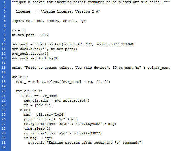 El programa crea una conexión de socket abierto para aceptar una sesión de telnet entrante. También imprime las órdenes recibidas a la pantalla mientras que envía por el puerto serie. Poner este archivo en la tarjeta de SD en el directorio /ase/scripts / .