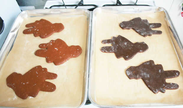 Cuando la masa es alrededor 1/4" densamente (prefiera!), recorta las formas y colocarlas bien separación en una bandeja forrada con.