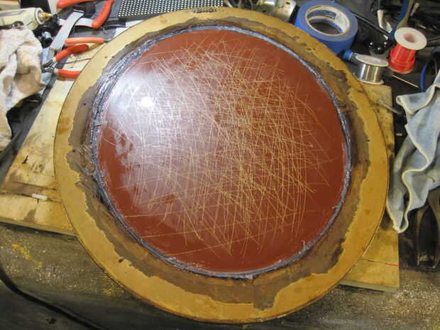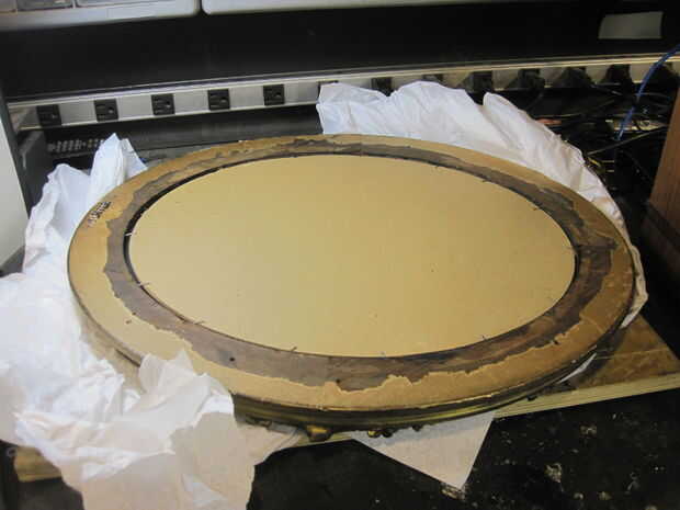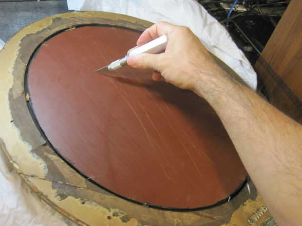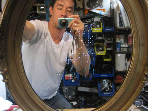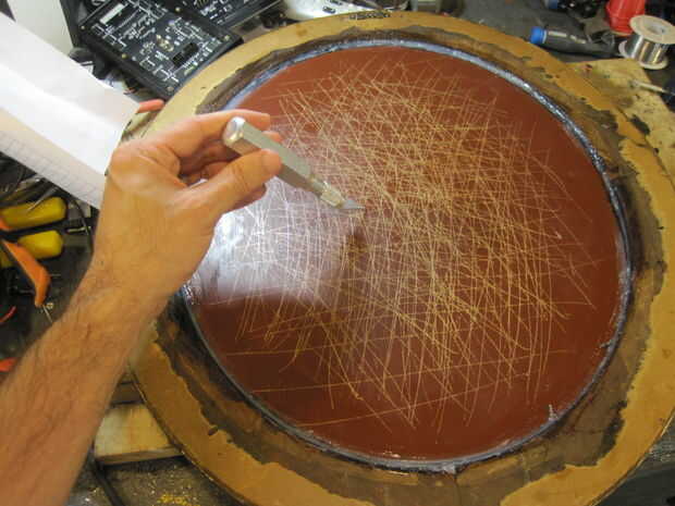 La idea es rayar el espejo suficiente tal que la matriz de LED que se montarán en la parte posterior del espejo brillará a través de. Toma tu cuchillo del exacto y hacer rayas verticales. Es una línea muy fina entre muchos arañazos y no es suficiente así que prueba junto con la forma y ver cuánto de la matriz de LED brilla a través de.