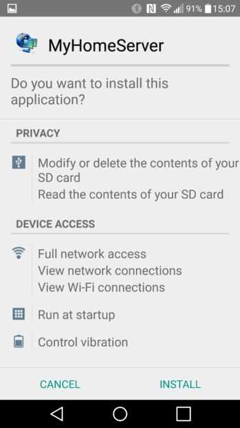3) con la aplicación de administrador de archivo por defecto el archivo MyHomeServer.apk copiado antes y haga clic en él. El proceso de instalación comenzará. Elija instalar entonces hecho.
