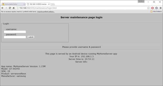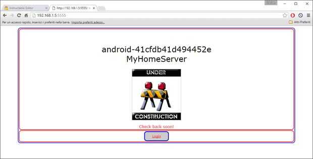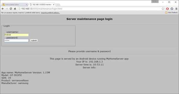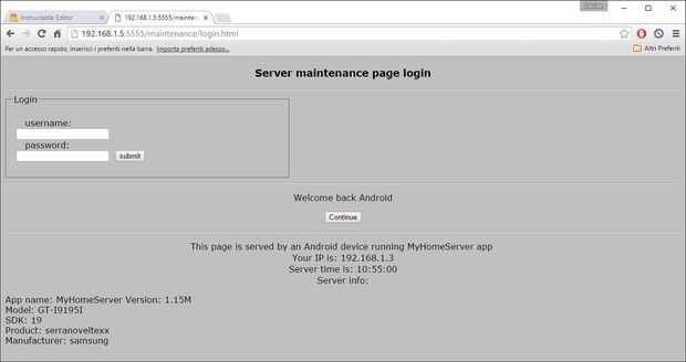 3) después de un poco (depende del router) el navegador debe mostrar el servidor de página de inicio predeterminada con la imagen de construcción de bajo y el botón de inicio de sesión. Haga clic en él y en la página de inicio Ingrese nombre de usuario: Android , contraseña: Android o las credenciales se establece en el paso anterior si cambió.