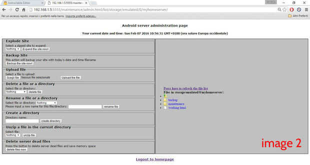 Esta página es bastante simple. La página tiene 2 paneles: en el panel izquierdo se puede trabajar con archivos y carpetas, el panel de la derecha es la navegación de archivos y carpetas. En la parte inferior hay un enlace para volver a la Página principal y sesión automáticamente.