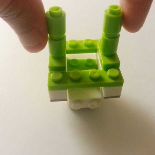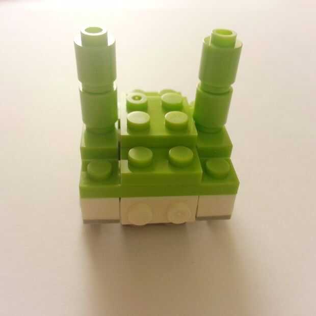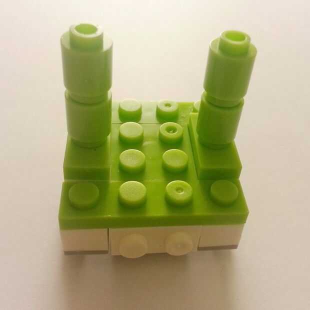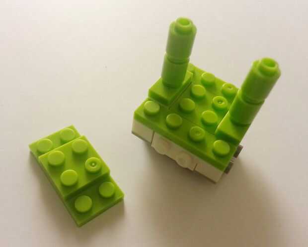 2. Un 2 x 2 bloque Lego verde encima de bloque Lego verde 2 x 4, justo en el centro de la pila.