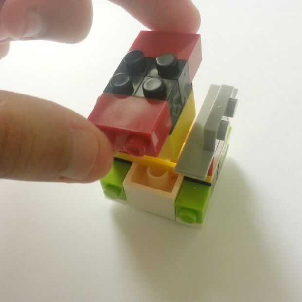 2. Coloque el bloque de Lego negro (que tiene el Lego rojo adjunto) a un lado del Lego amarillo. Repetir el mismo proceso en el otro lado.