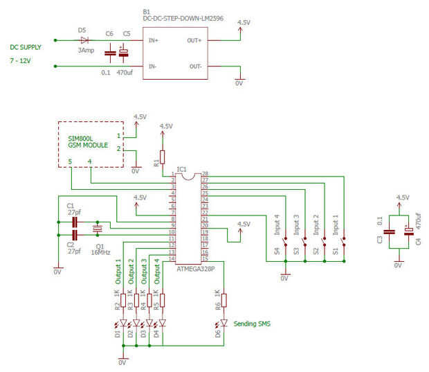 La potencia del circuito es mediante el conversor DC/DC, con la tensión de salida a 4.5V. Hay cuatro LEDs para simular las salidas digitales y cuatro botones para las entradas digitales. El SIM800L está conectado a los pines Rx/Tx del ATMEGA328p.