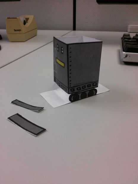 La línea de doblez donde sus ruedas se encuentran con la banda de rodadura (tal como se indica por < en la plantilla). Pegue las lengüetas blancas en el interior de sus lados (B & D lados coincidentes). Asegúrese de tener la línea en la parte superior de las ruedas (a *) conoce a la línea en la parte inferior de los costados.