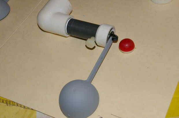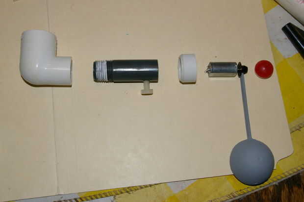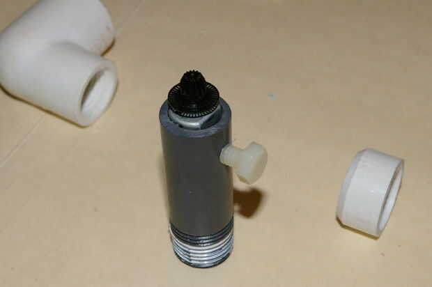 Todavía no me gusto la exposición de tiempo tenía el motor, utilizando una sierra de mano cortar el acoplador de 1/2 por la mitad, y usando la cubeta más grande he, chaflanado interior borde cortado así inmersión agua apagado el exterior borde y usando mi lijadora de banda, afianzado con abrazadera boca abajo en mi prensa, biselado del borde superior para que no se sostendría en gotas de agua. El acoplador se ajustaron entonces sobre el extremo cortado de la entrerrosca. Esto se puede hacer con cemento de PVC, pero el epoxy deja un grano agradable y puede ser alisado.