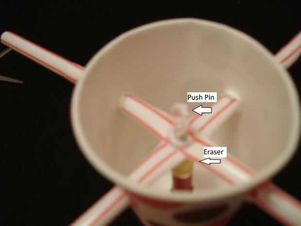 Meter el alfiler a través de la paja de los dos y en el borrador del lápiz.