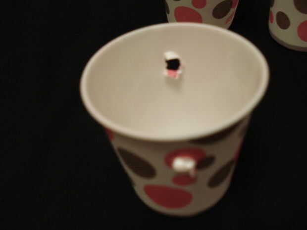 Con las tijeras hacer dos agujeros en las restantes 4 tazas. Asegúrese de que estos agujeros están enfrente de uno al otro y son la misma distancia desde el borde de las copas.
