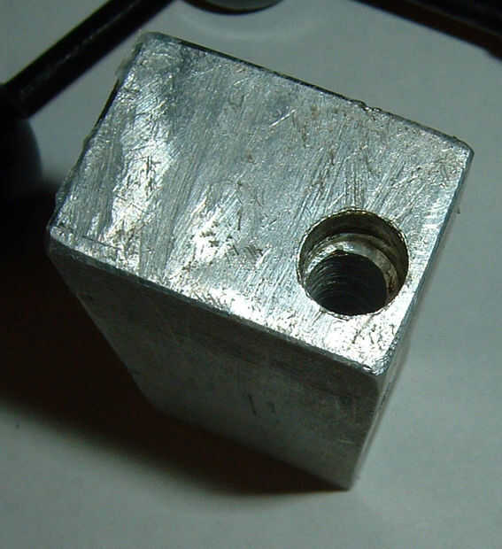 Ahora se necesita algo para mantener los cojinetes y el eje. Usted podría ser capaz de encontrar algo en la tienda de hobby que funcionaría. Pero en el peor de los casos, sólo un bloque de aluminio, plástico o madera que es aproximadamente 1" de diámetro y 2" de largo. Perfore un agujero a través del largo camino, más grande que el eje pero menor que el diámetro exterior de los rodamientos. por ejemplo con rodamientos que tienen un 1/8 ID y 3/8" OD, perforé un orificio de 1/4" por lo que el eje no tocarlo. En cualquiera de los extremos del bloque de taladrar un agujero 3/8" derecha en la parte superior del orificio 1/4", pero sólo perforar en aproximadamente 1/4"(lo suficiente para el cojinete encajar en el bloque.