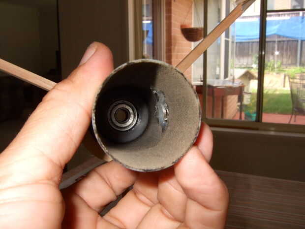 Aquí está mi anemómetro DIY usando un cojinete de bolas, un velocímetro de bicicleta, tubo de aluminio, pegamento, madera,