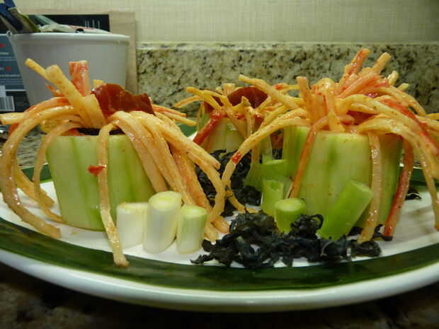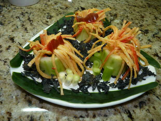 Usar las algas y cebolletas y el pepino pelan para decorar y presentar su anemona surime y pepino.